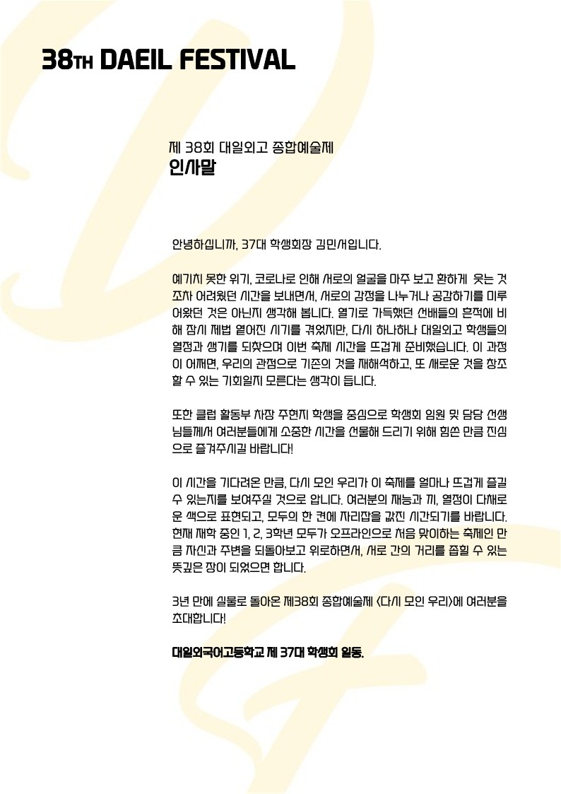 Á¦38ȸ ´ëÀϿܱ¹¾î°íµîÇб³ Á¾ÇÕ¿¹¼úÁ¦ ¸®Ç÷¿À» ¾Æ·¡¿¡ ÷ºÎÇØµå¸³´Ï´Ù.