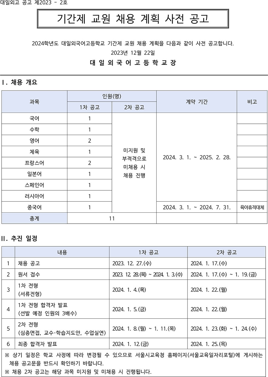 2024Çг⵵ ´ëÀϿܱ¹¾î°íµîÇб³ ±â°£Á¦ ±³¿ø ä¿ë°èȹ »çÀü°ø°³