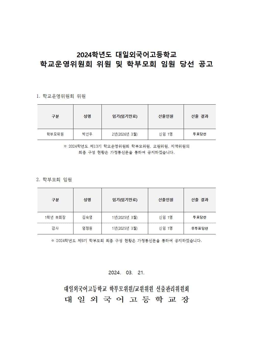2024Çг⵵ ´ëÀϿܱ¹¾î°íµîÇб³ Çб³¿î¿µÀ§¿øÈ¸ À§¿ø ¹× Çкθðȸ ÀÓ¿ø Èĺ¸ µî·Ï°ú ¼±Ãâ °úÁ¤À» °ÅÃÄ È®Á¤µÈ ÃÖÁ¾ ´ç¼± °á°ú¸¦ ¾Æ·¡¿Í °°ÀÌ °ø°íÇÕ´Ï´Ù.