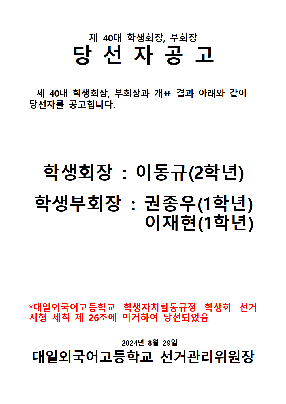 Á¦ 40´ë ÇлýȸÀå, ºÎȸÀå ´ç¼± °ø°í