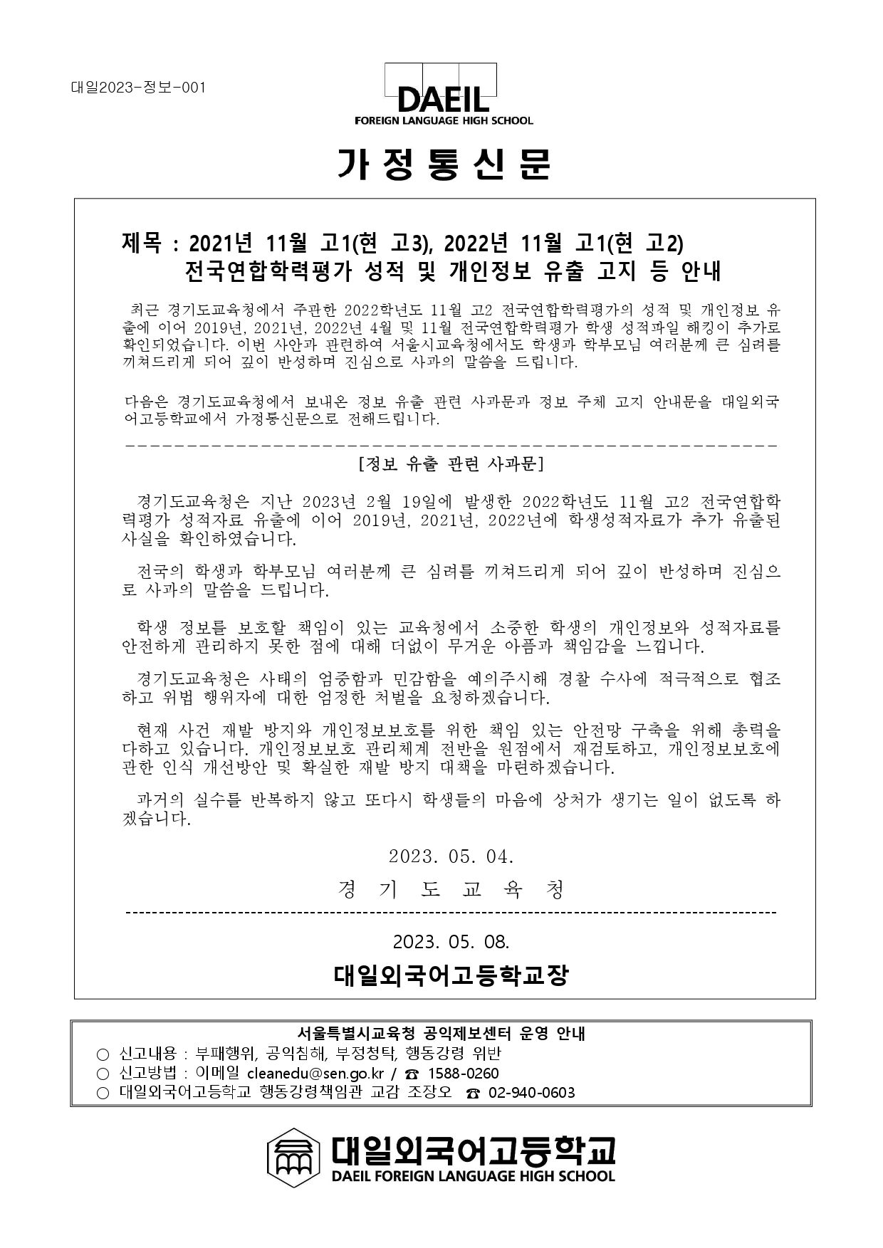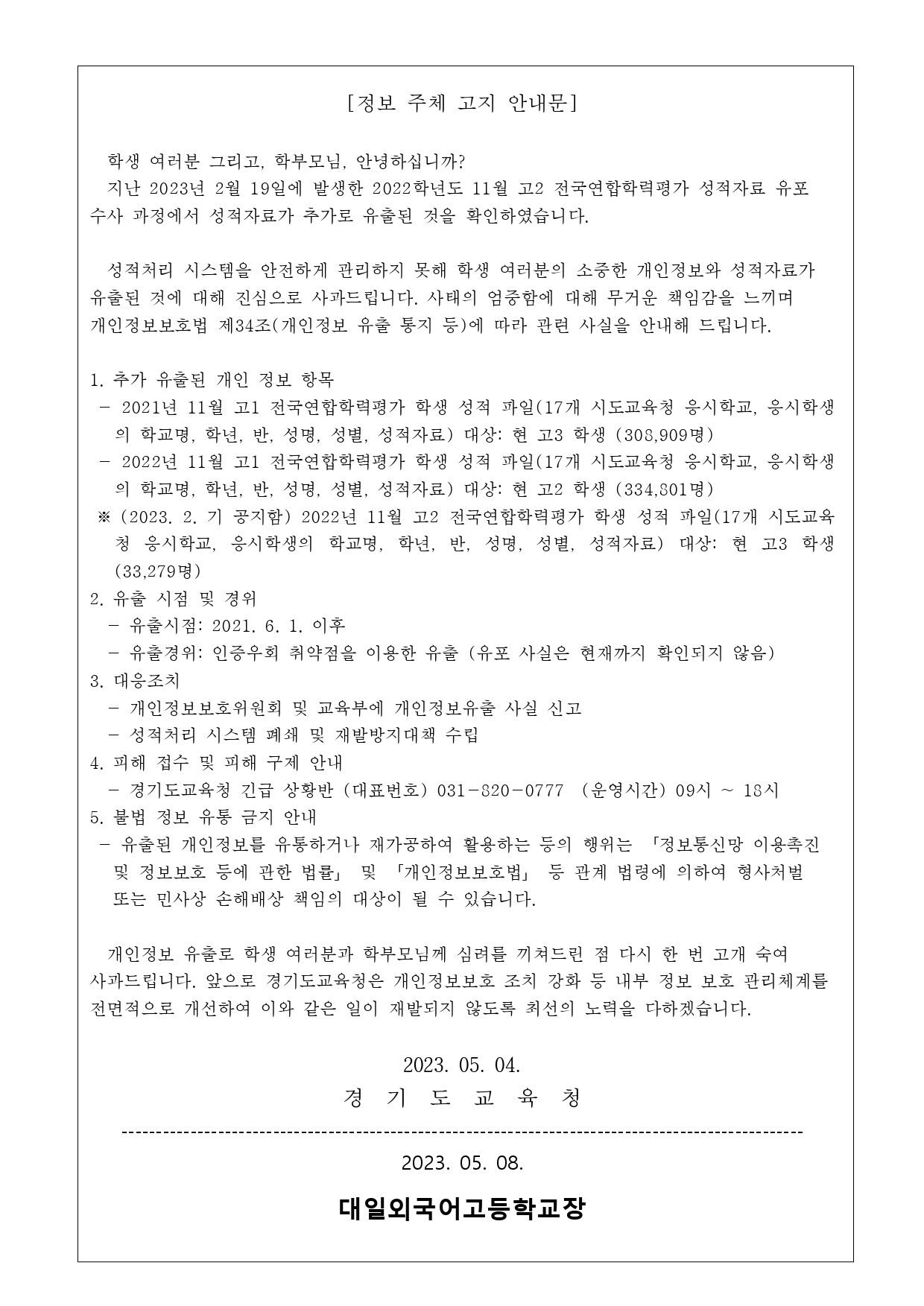 °æ±âµµ±³À°Ã» ½ÃÇà Àü±¹¿¬ÇÕÇÐ·ÂÆò°¡ ¼ºÀû ¹× °³ÀÎÁ¤º¸ À¯Ãâ Ãß°¡ °íÁö