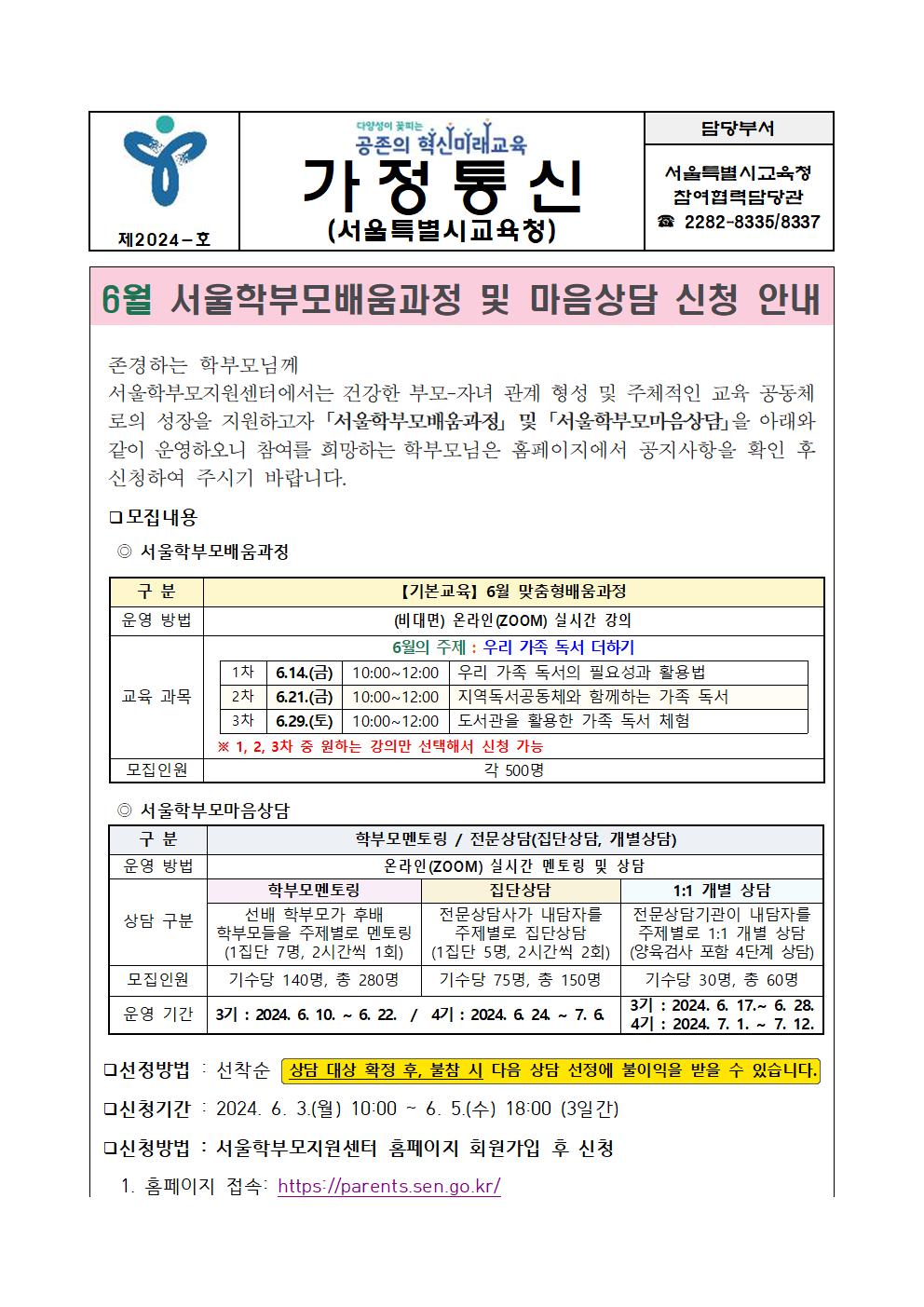 6¿ù ¼­¿ïÇкθð¹è¿ò°úÁ¤ ¹× ¸¶À½»ó´ã ½Åû ¾È³»